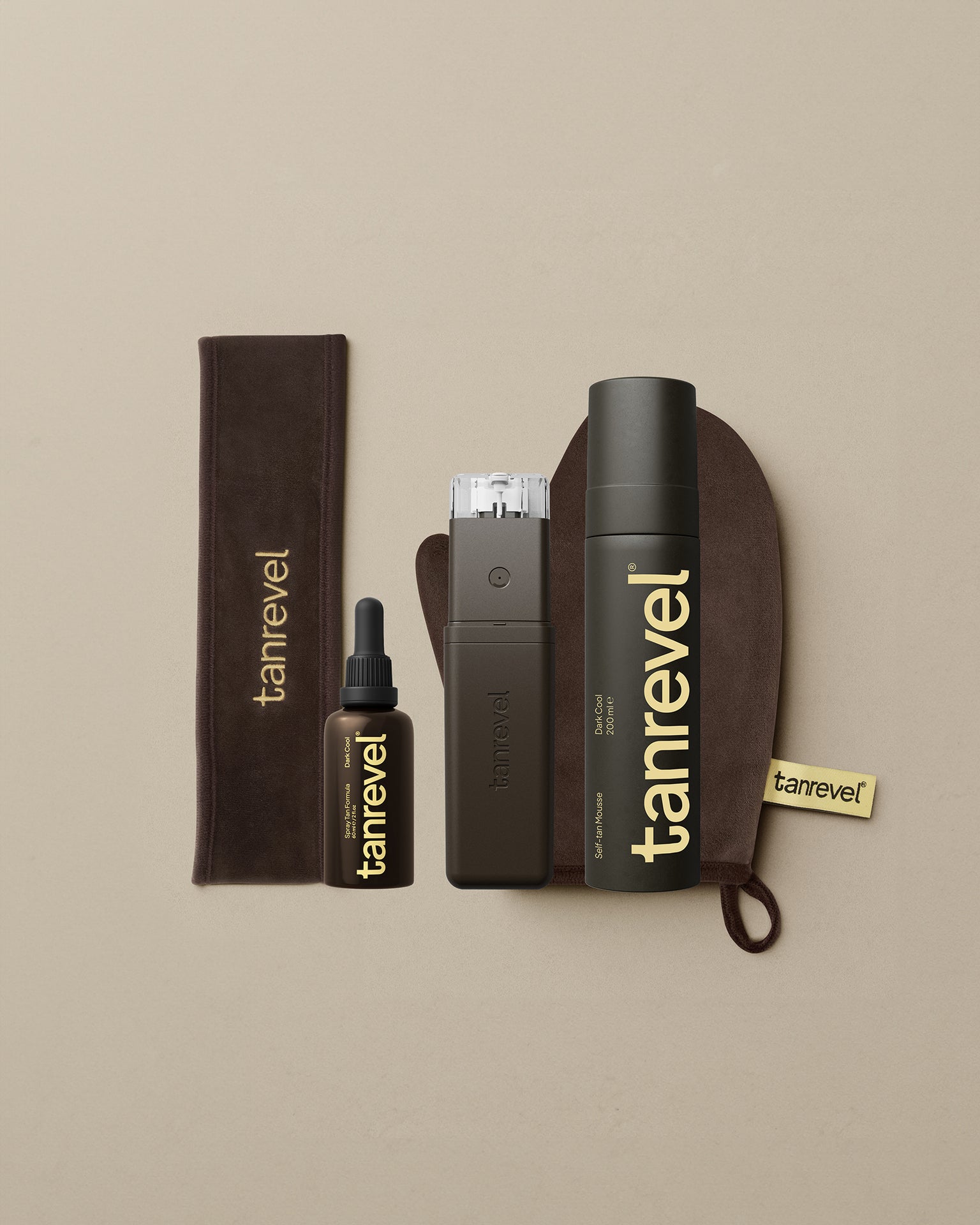 Fill the tank of your Tanrevel® Pro with Spray Tan Formula Dark Cool.  Use the Tanrevel® Headband to protect your hair during application. Hold the device about 30–40 cm from your skin and spray onto clean, dry skin using slow, even motions for about 15–20 seconds. The formula is buildable, allowing you to adjust the intensity by applying multiple layers. It provides an immediate visible result thanks to its guide color and fully develops within 3–6 hours.